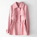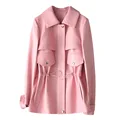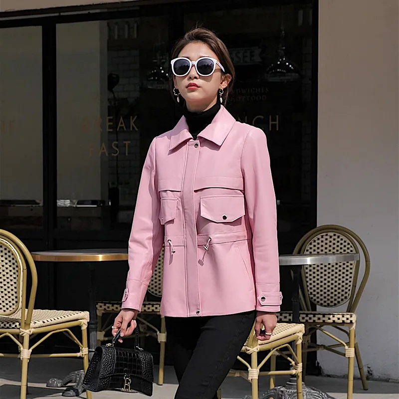 Best Selling Real Sheepskin Mid Length Casual Pleated Pink Jacket Women High Quality Soft Leather Coat Spring High Street